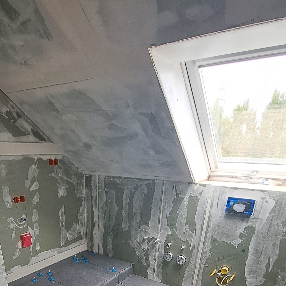 Wir haben Trockenbauwände und Decke erstellt, den Boden vorbereitet, die elektrische Fußbodenheizung eingebaut, bevor es ans Verlegen der Fliesen ging.