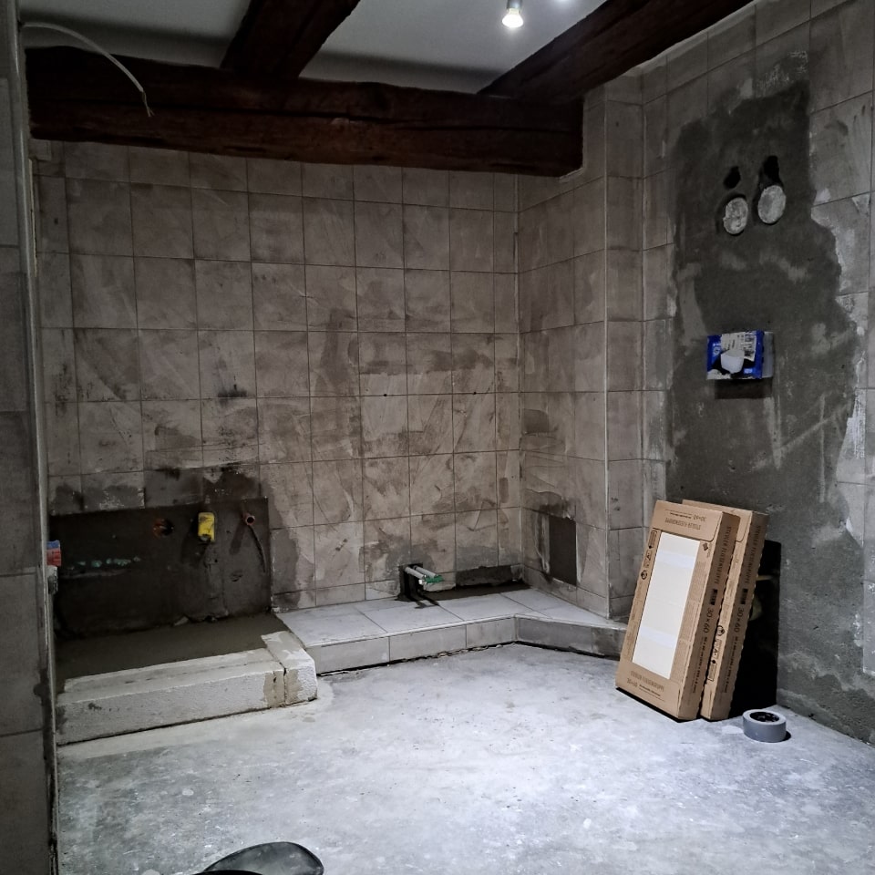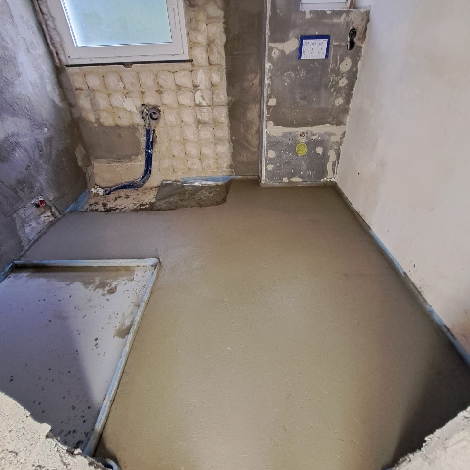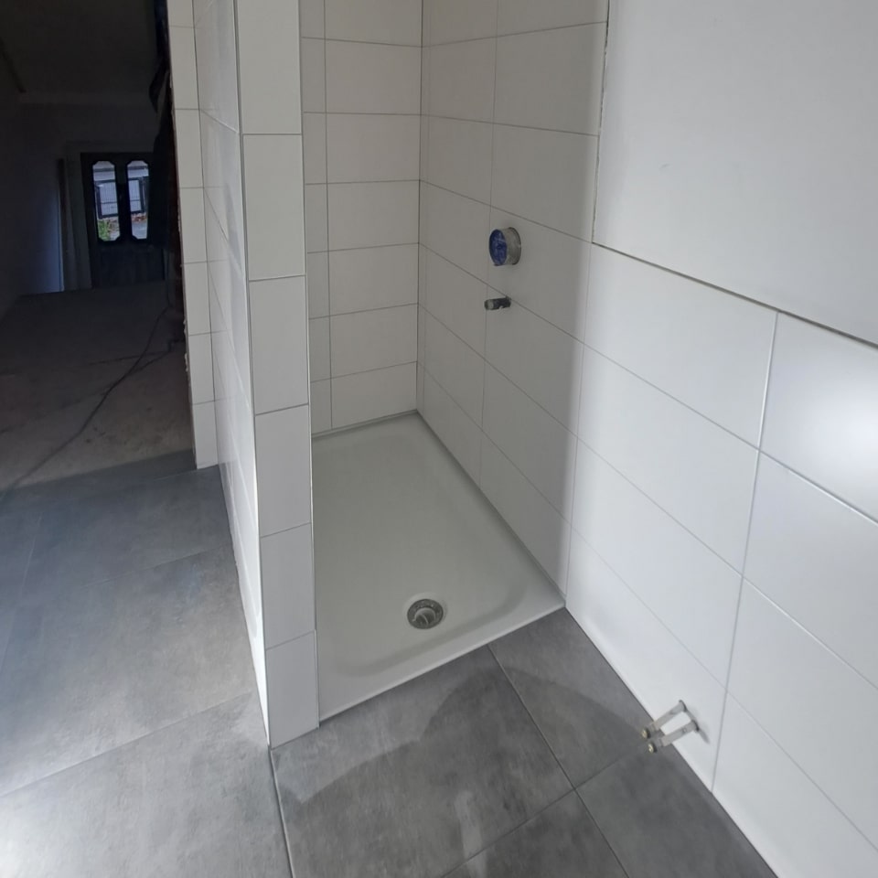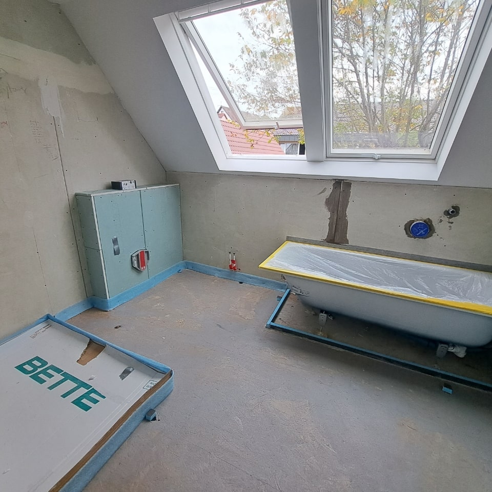 Unsere Aufgaben waren unter anderem: Bodenbeläge ausgleichen, Mauerarbeiten an den Trennwänden vornehmen, die Nassbereiche abdichten, die Badewanne neu verkleiden sowie die Flächen neu grundieren.