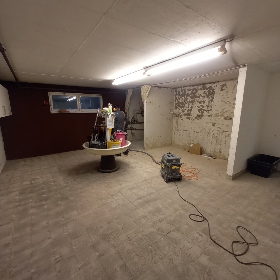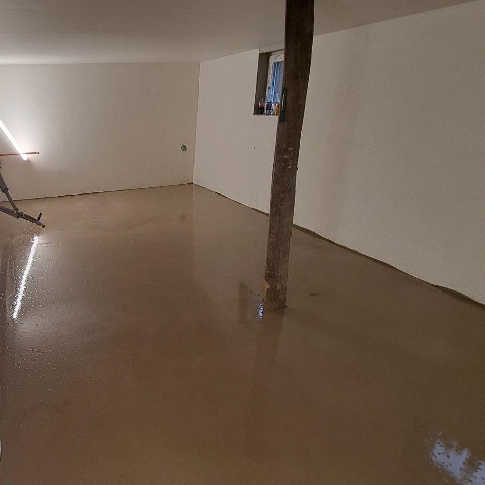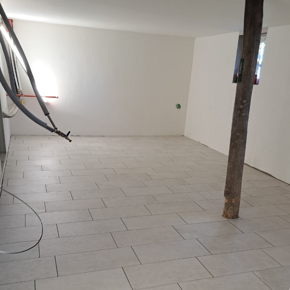 Der Keller wurde im wilden Verband gefliest. Im wilden Verband werden die Fliesen, wie der Name bereits verrät, in unregelmäßig wechselnden Abständen und fortlaufend verlegt. Davor wurde der Betonuntergrund geschliffen, grundiert und gespachtelt. In die Spachtelmasse von Sopro Bauchemie wurde ein Gewebe eingelegt.