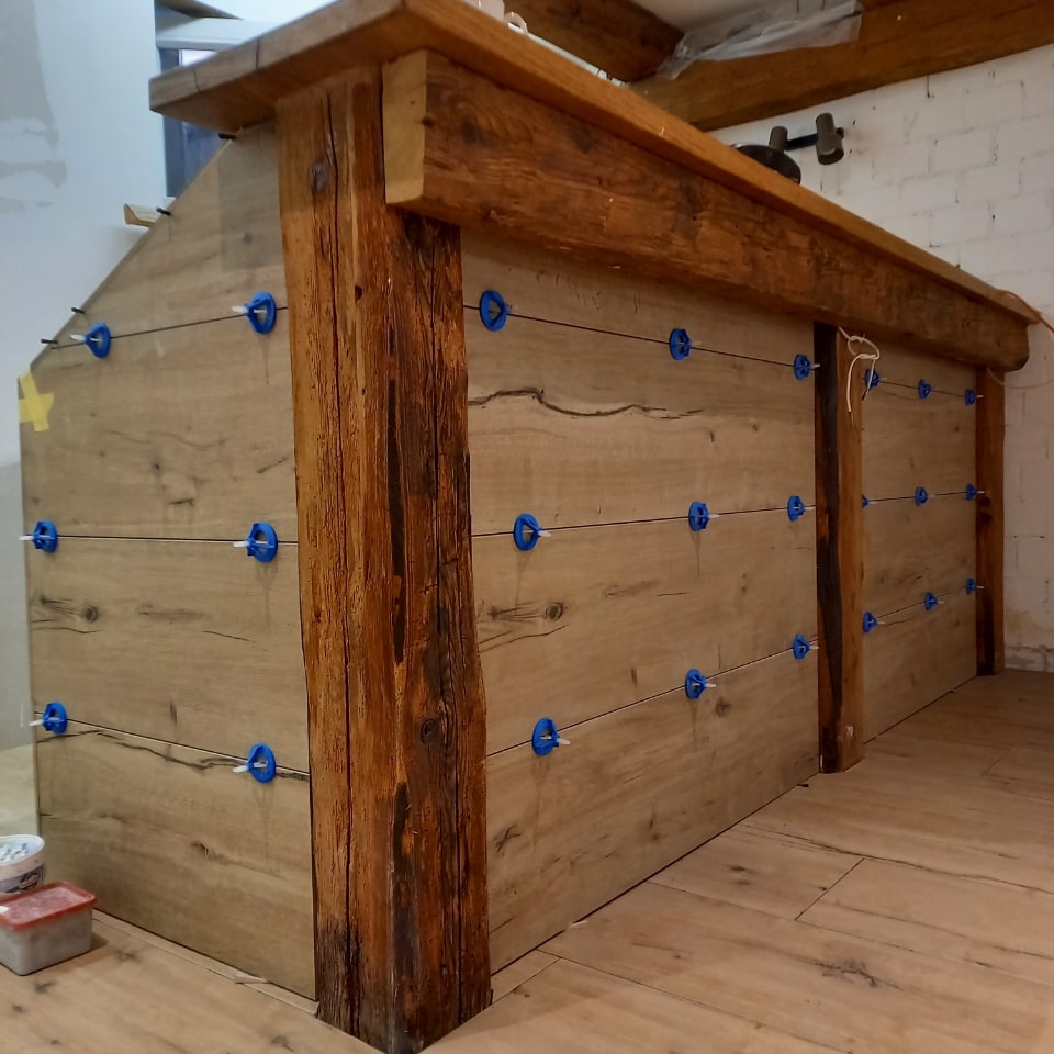 Die Böden im Sanitärbereich, Flur und Aufenthaltsraum wurden mit Holzoptikfliesen verlegt. Die Theke des Aufenthaltsraum wurde ebenfalls mit den Bodenfliesen verkleidet und so optisch integriert.